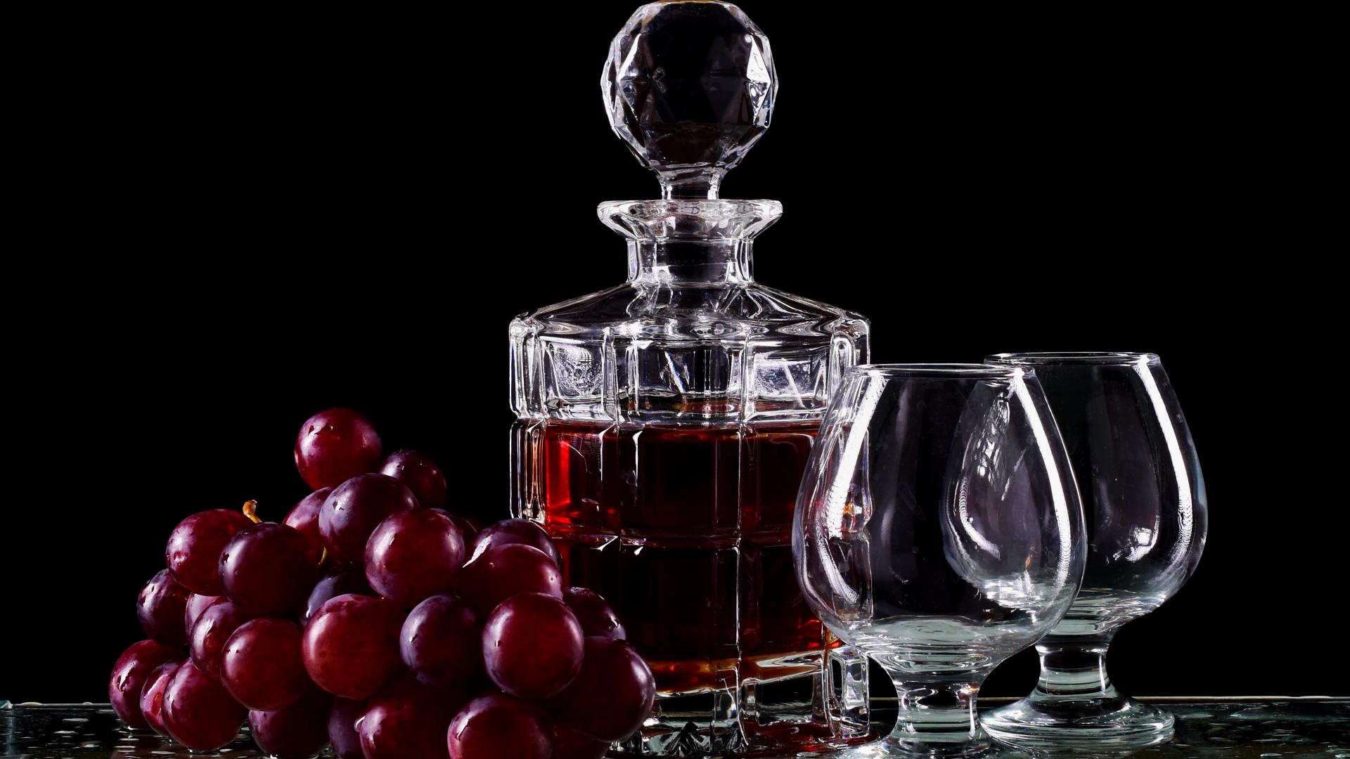 Wallpaper Decanter with cognac on the table with glasses and grapes