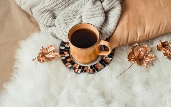 Wallpaper A cup of coffee is on a bedspread with a warm sweater