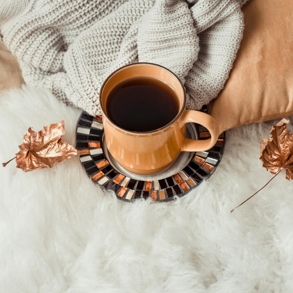 Wallpaper A cup of coffee is on a bedspread with a warm sweater