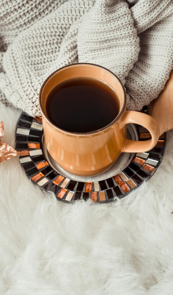 Wallpaper A cup of coffee is on a bedspread with a warm sweater