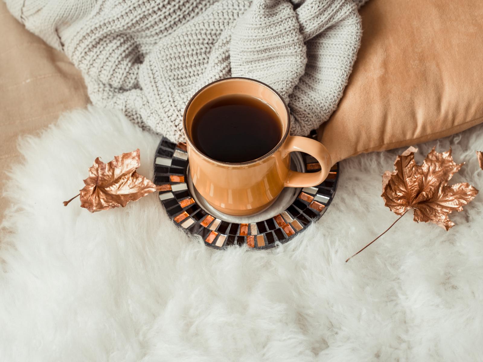 Wallpaper A cup of coffee is on a bedspread with a warm sweater