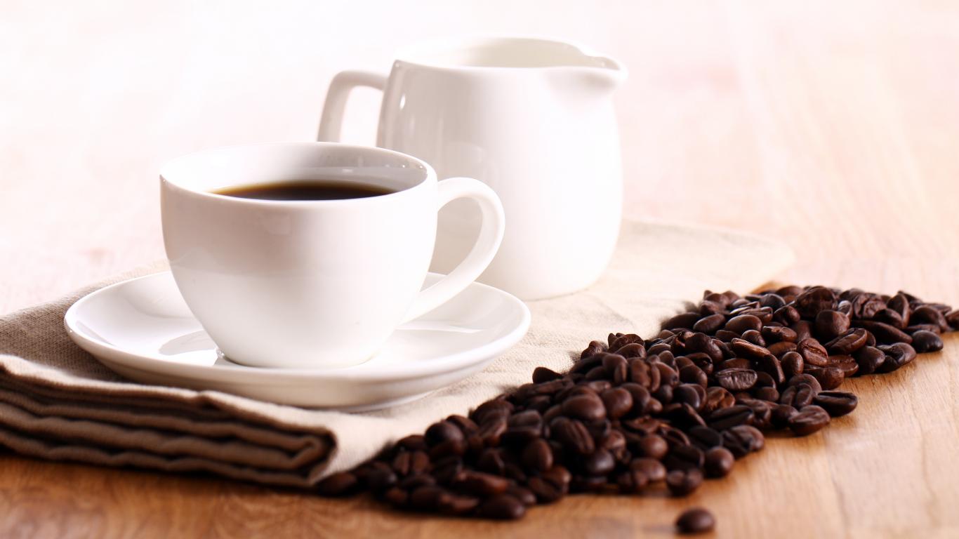Wallpaper White cup of coffee on table with milk and grains