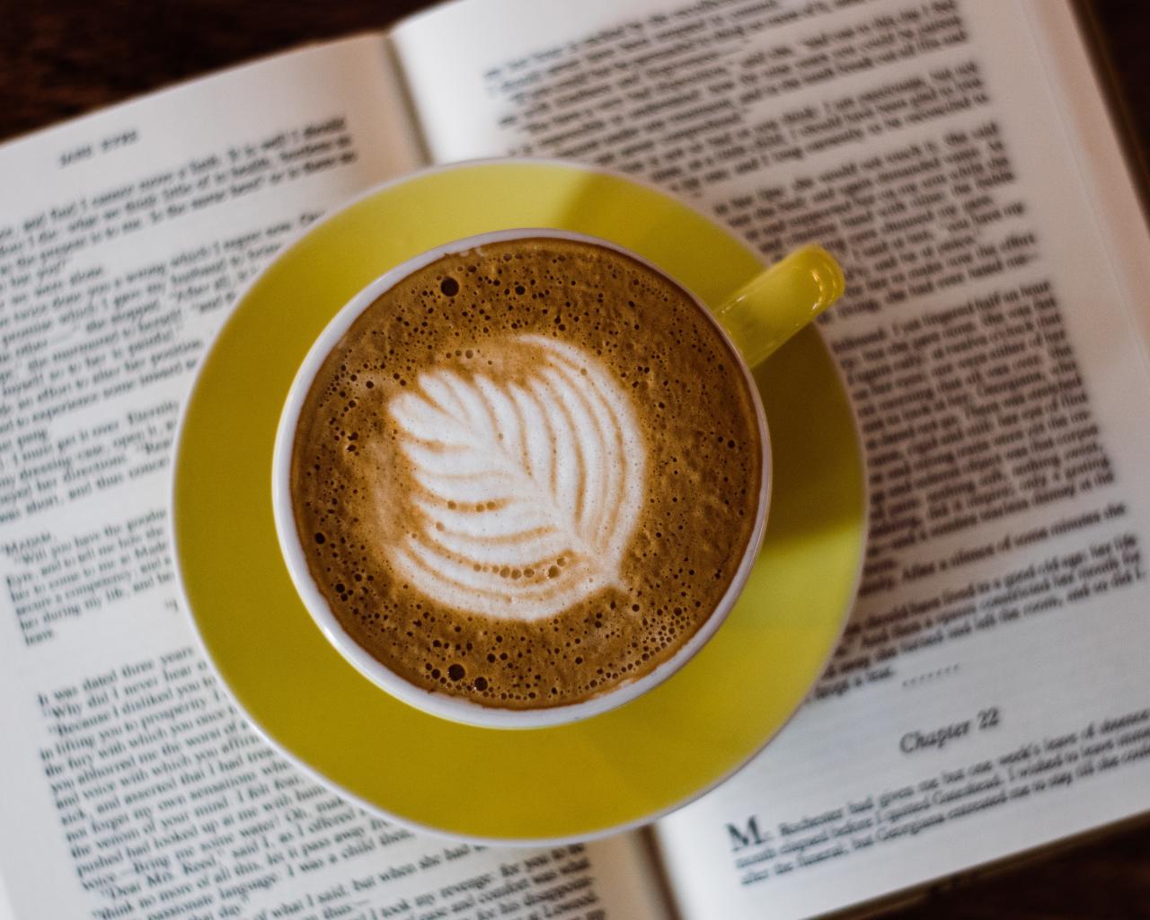 Wallpaper Cup of coffee on a table with a book, glasses and physalis
