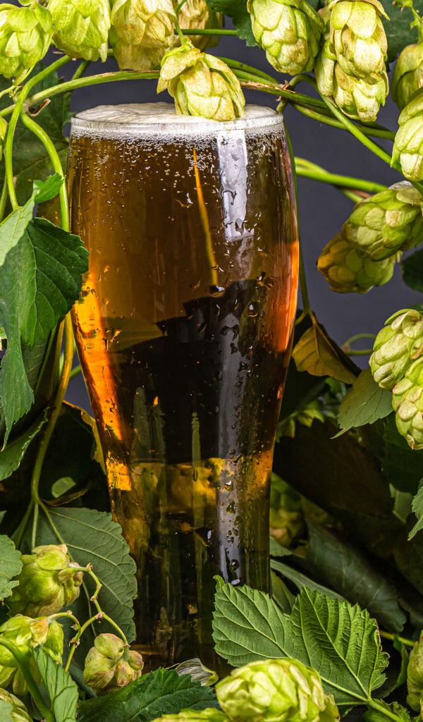 Wallpaper Glass of cold beer with hop cones on gray background