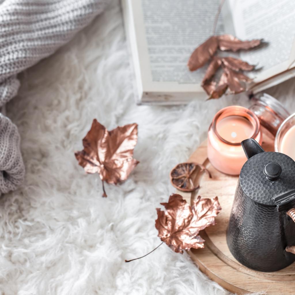 Wallpaper Milk tea on the bed with a book and a warm sweater