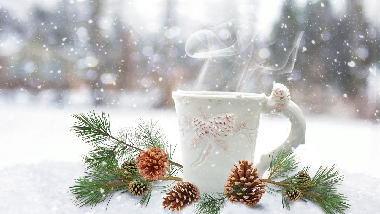 Wallpaper Cup of hot coffee on the snow with a pine branch