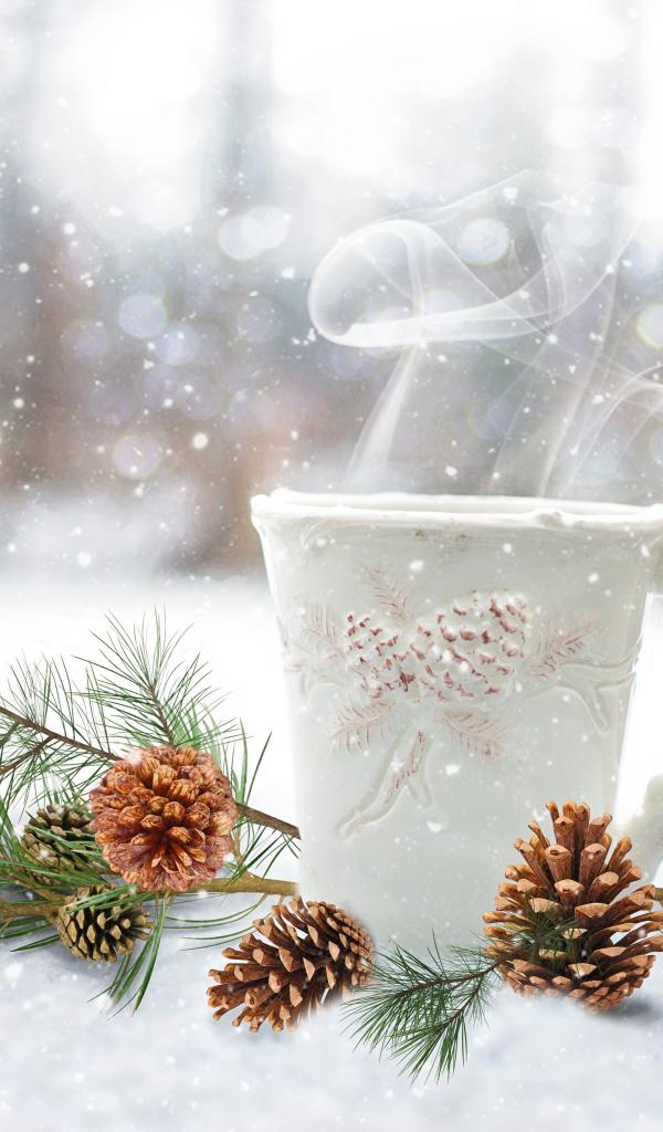 Wallpaper Cup of hot coffee on the snow with a pine branch