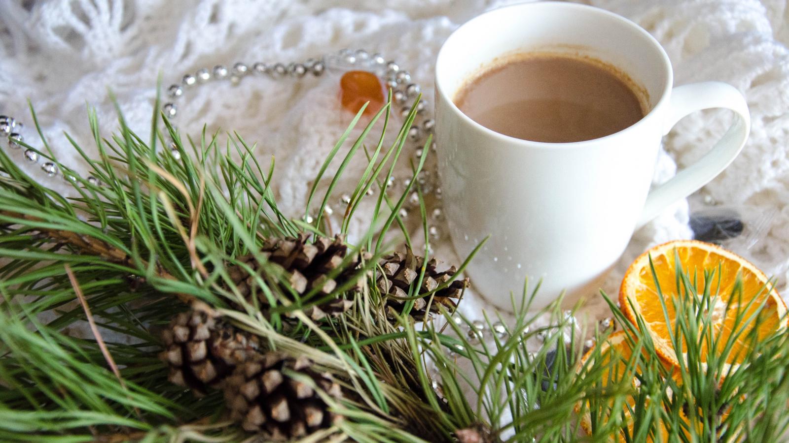 Wallpaper Cup of hot cocoa with pine branch and oranges