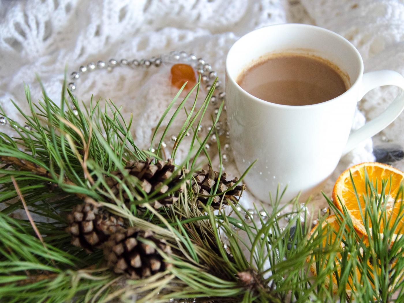 Wallpaper Cup of hot cocoa with pine branch and oranges