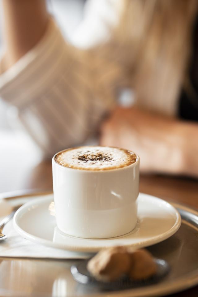 Wallpaper Cup of cappuccino with cinnamon on a table in a cafe