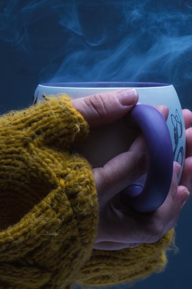 Wallpaper A cup of hot coffee in the hands of a girl on a gray background