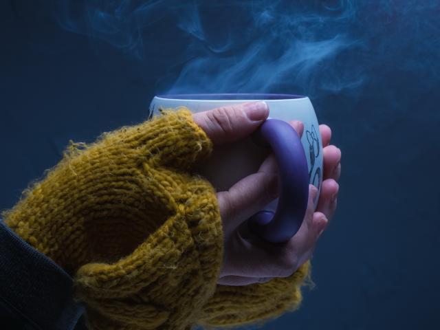 Wallpaper A cup of hot coffee in the hands of a girl on a gray background