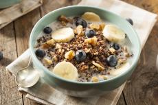 Wallpaper Cup of milk with muesli on a table with spikelets