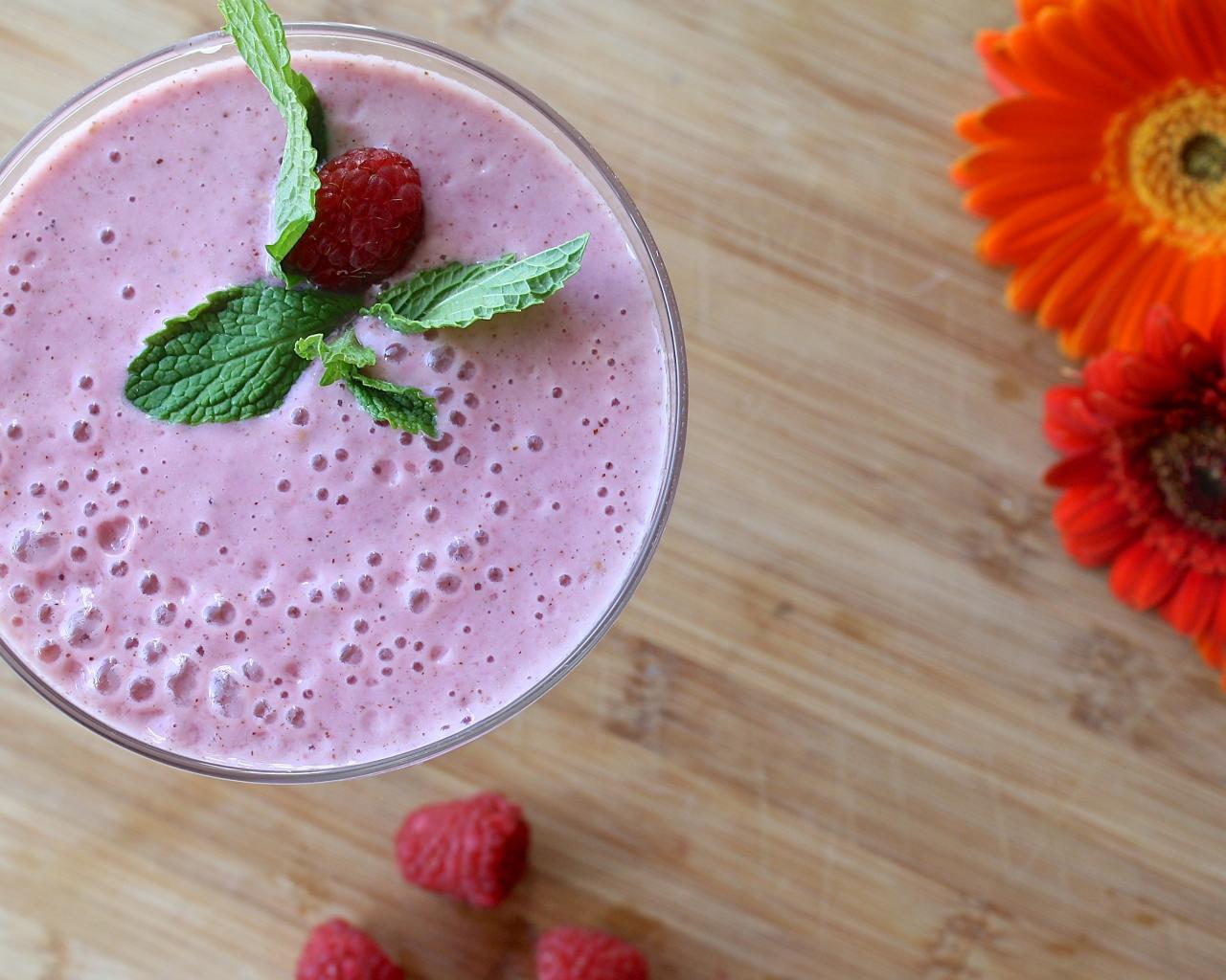 Wallpaper Raspberry smoothie in a glass on a table with gerberas