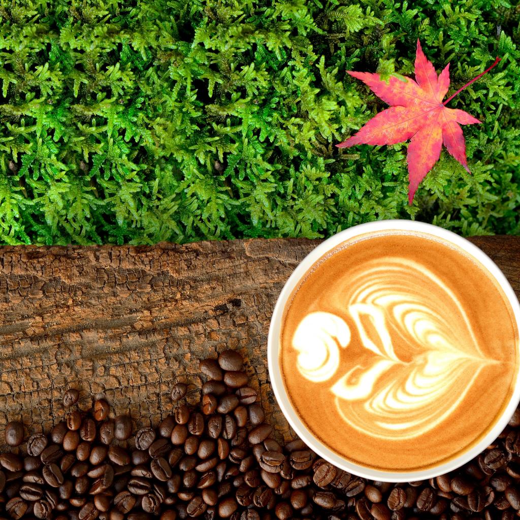 Wallpaper White cup of coffee on a log with moss