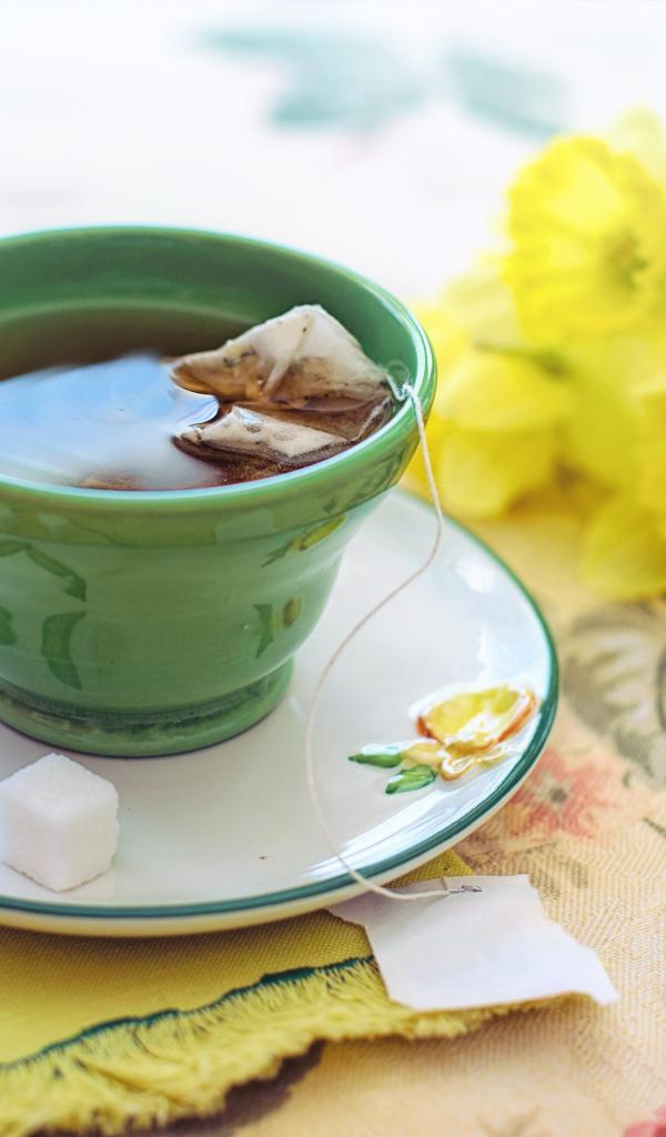 Wallpaper Cup of tea on the table with sugar and daffodils