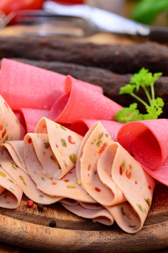 Wallpaper Appetizing sausage slices on a cutting board with onion rings