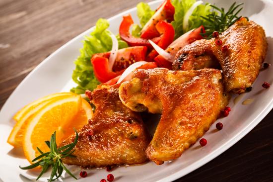 Wallpaper Fried chicken wings with vegetables and ketchup on a white plate