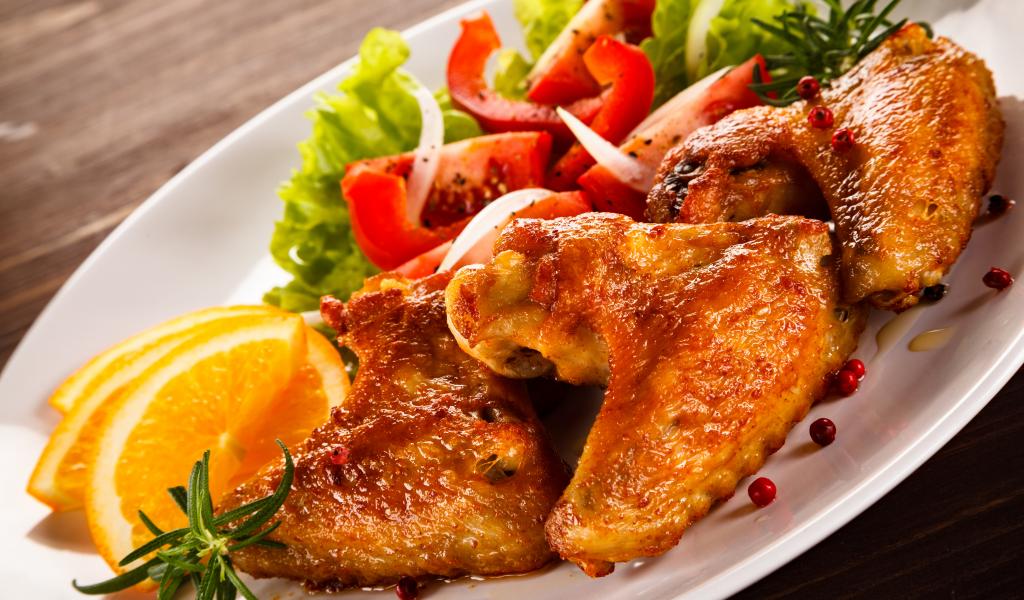 Wallpaper Fried chicken wings with vegetables and ketchup on a white plate