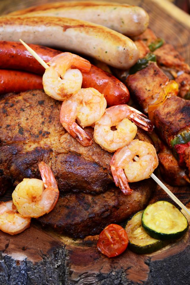 Wallpaper Appetizing meat and shrimp barbecue on the table