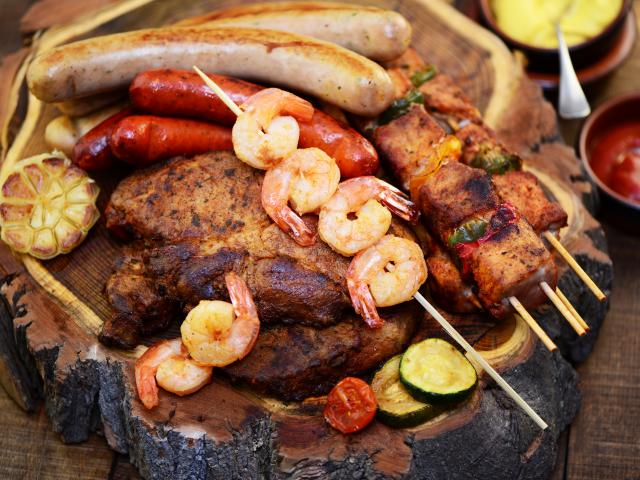 Wallpaper Appetizing meat and shrimp barbecue on the table