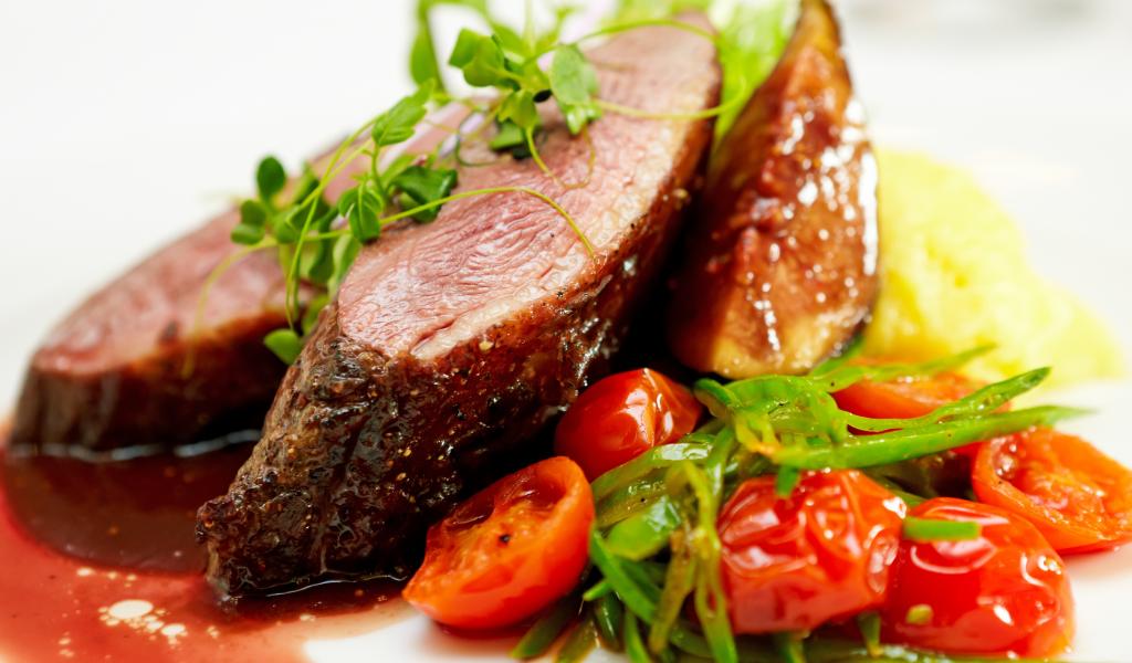 Wallpaper Juicy meat with tomatoes, sauce and greens