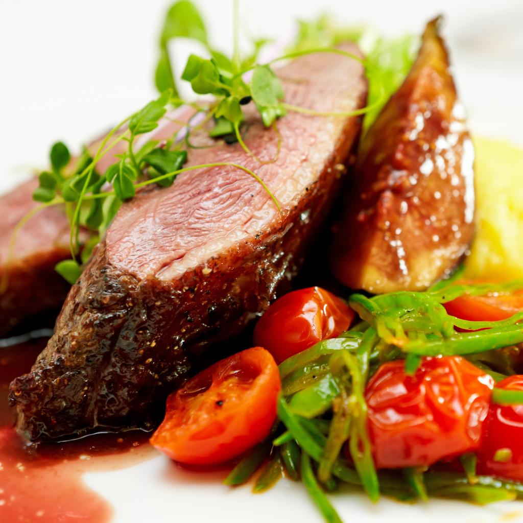 Wallpaper Juicy meat with tomatoes, sauce and greens