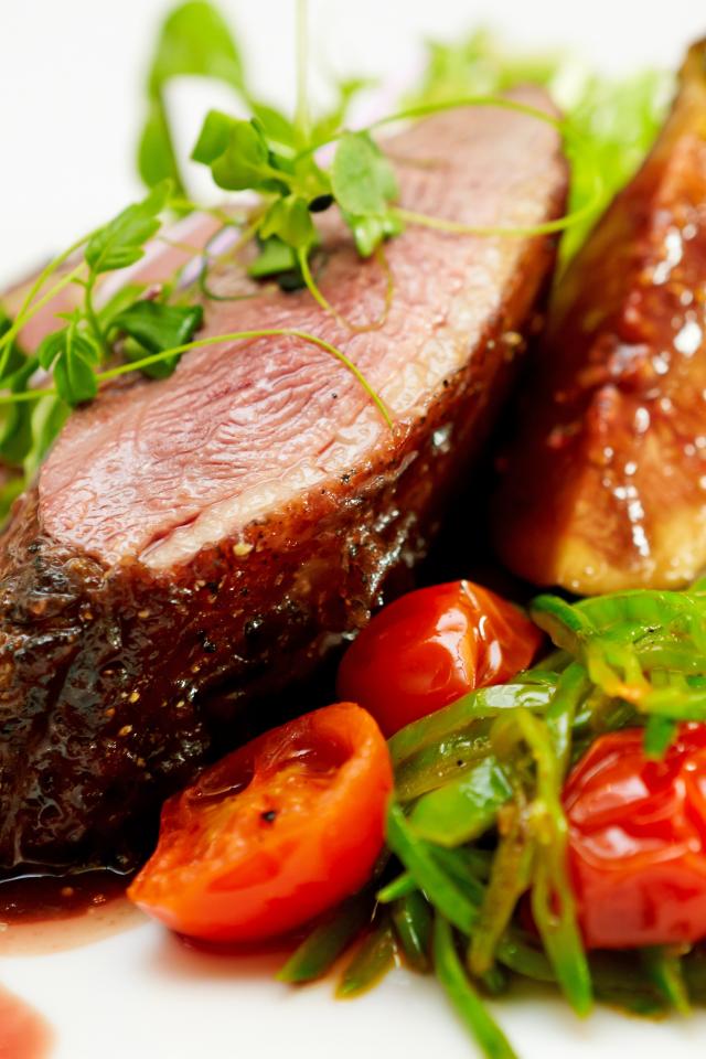 Wallpaper Juicy meat with tomatoes, sauce and greens