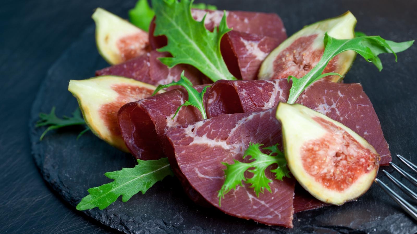 Wallpaper Fresh pieces of figs and apples in a plate on a table