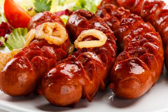 Wallpaper Appetizing sausage sliced on a cutting board with onion rings