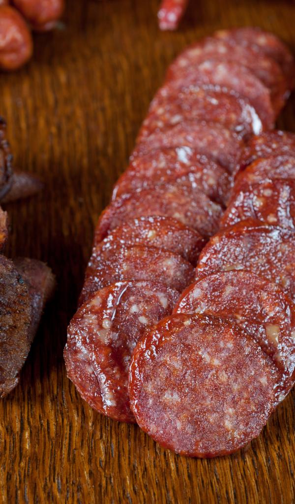 Wallpaper Sausage and meat sliced on the table