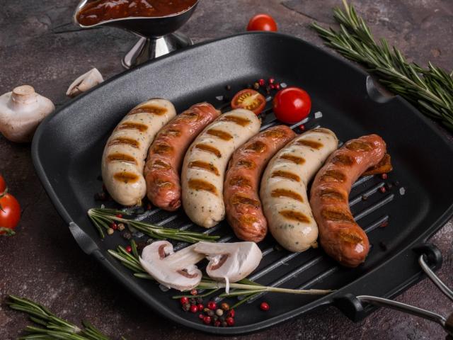 Wallpaper Grilled sausages on a table with vegetables