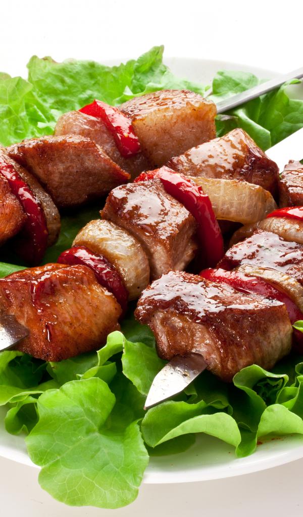 » Wallpaper Delicious kebab with lettuce leaves on skewers
