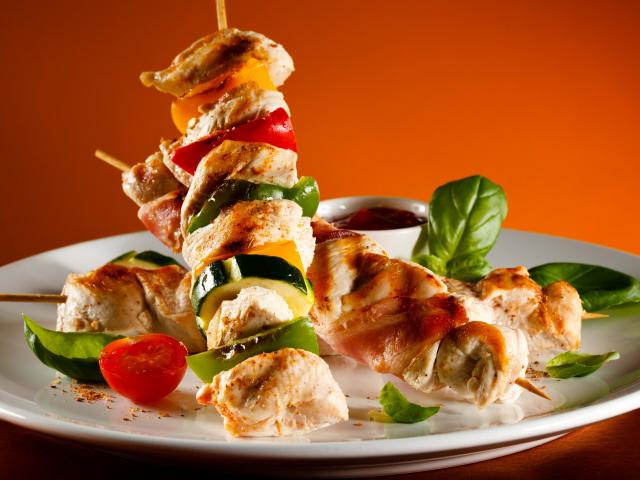 Wallpaper Chicken kebabs with vegetables on a white plate