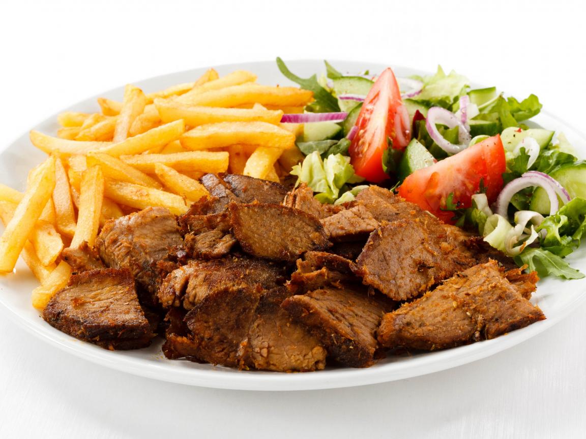 Wallpaper Slices of meat on a plate with french fries and salad
