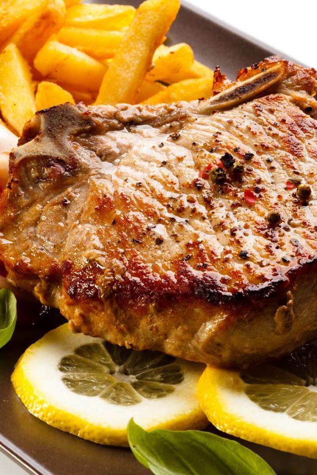 Wallpaper Meat with french fries, salad and lemon slices