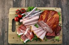 Wallpaper A piece of fried meat on a cutting board with tomatoes and garlic