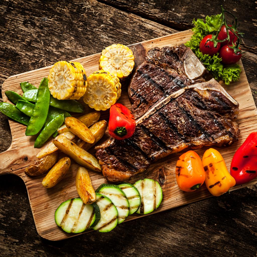 » Wallpaper A piece of meat on a cutting board with vegetables
