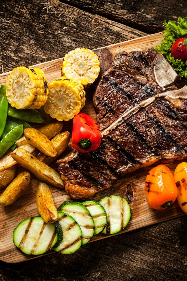 Wallpaper A piece of grilled meat on a board with salad and vegetables