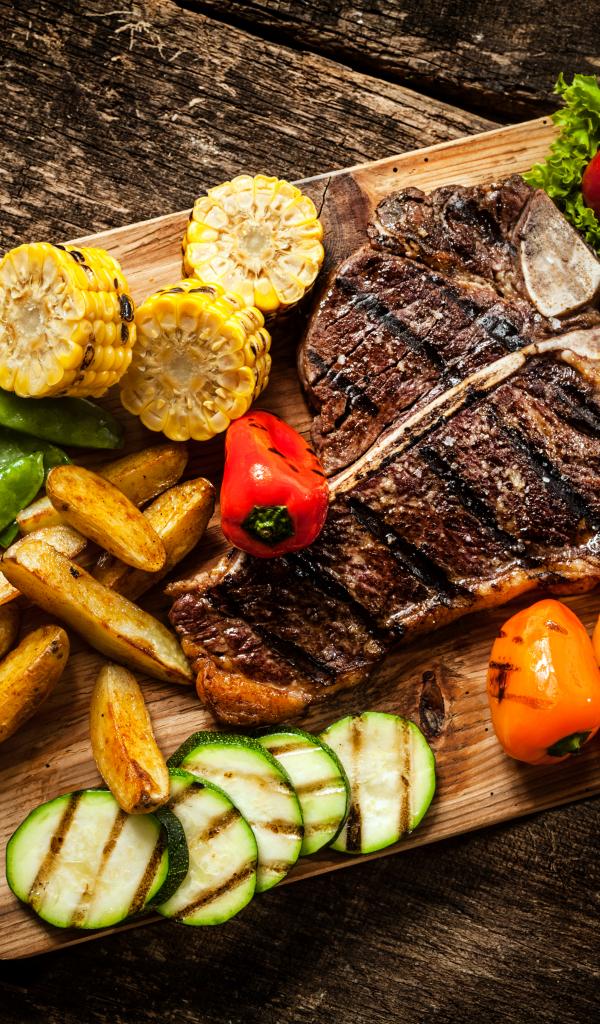 Wallpaper A piece of grilled meat on a board with salad and vegetables