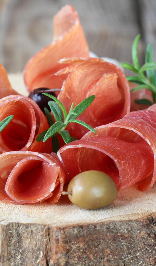 Wallpaper Prosciutto with olives on wooden table
