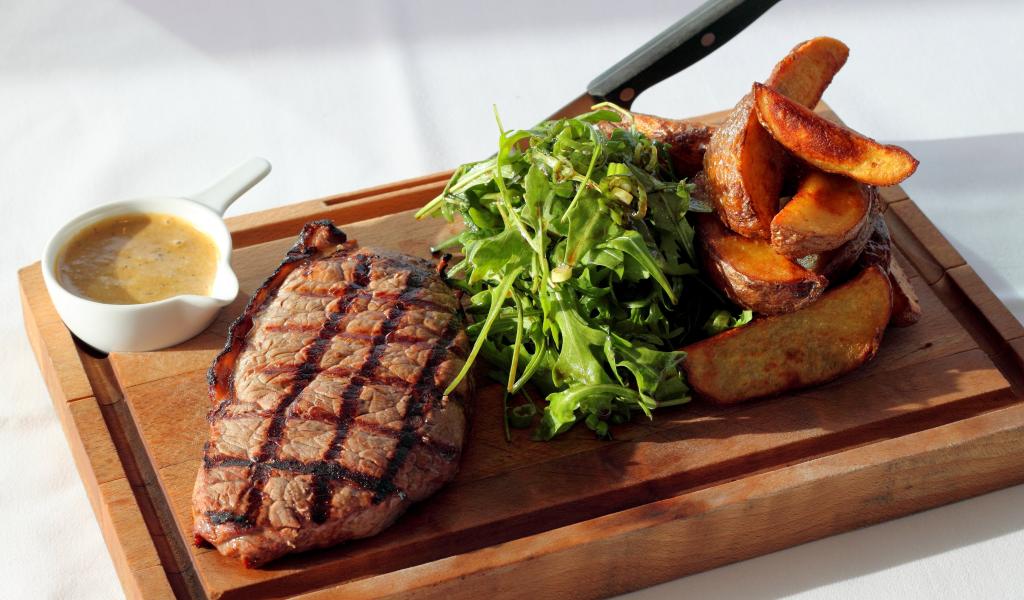 Wallpaper Steak on the board with potatoes, sauce and arugula