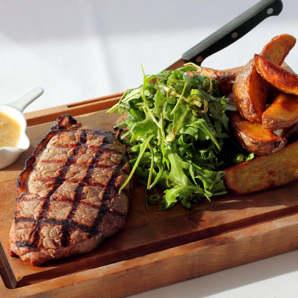 Wallpaper Steak on the board with potatoes, sauce and arugula