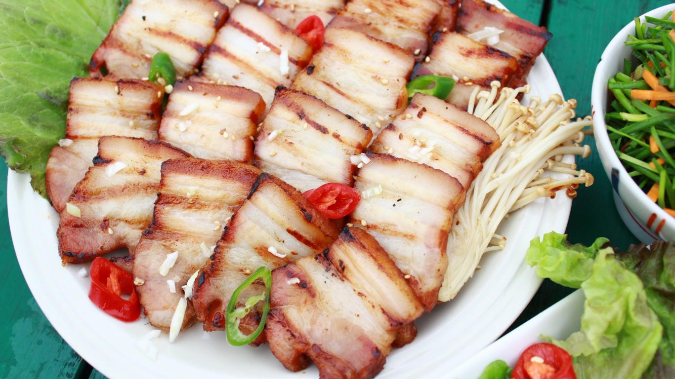 Wallpaper Appetizing smoked bacon on the table with vegetables