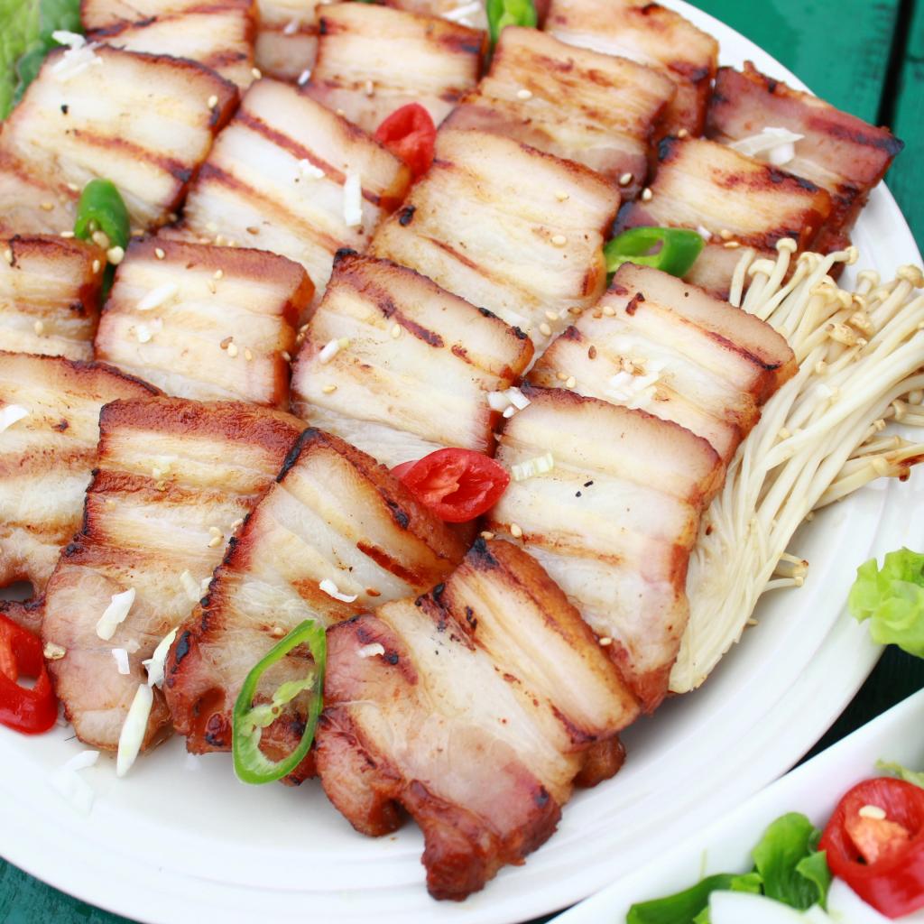 Wallpaper Appetizing smoked bacon on the table with vegetables