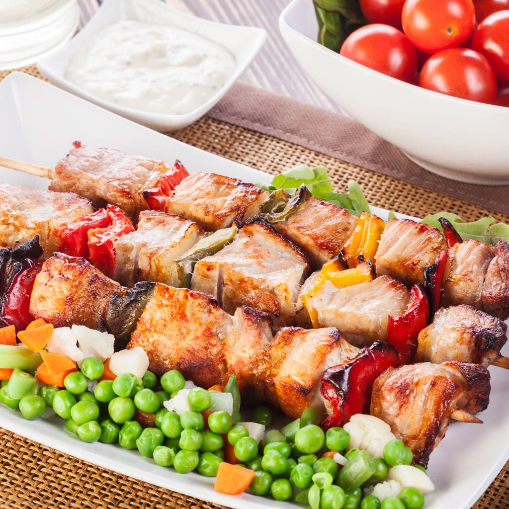 Wallpaper Appetizing ruddy skewers with green peas on a plate
