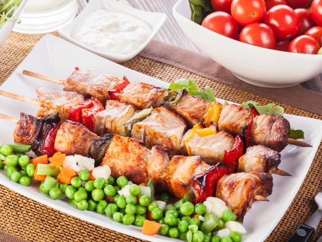 Wallpaper Appetizing ruddy skewers with green peas on a plate