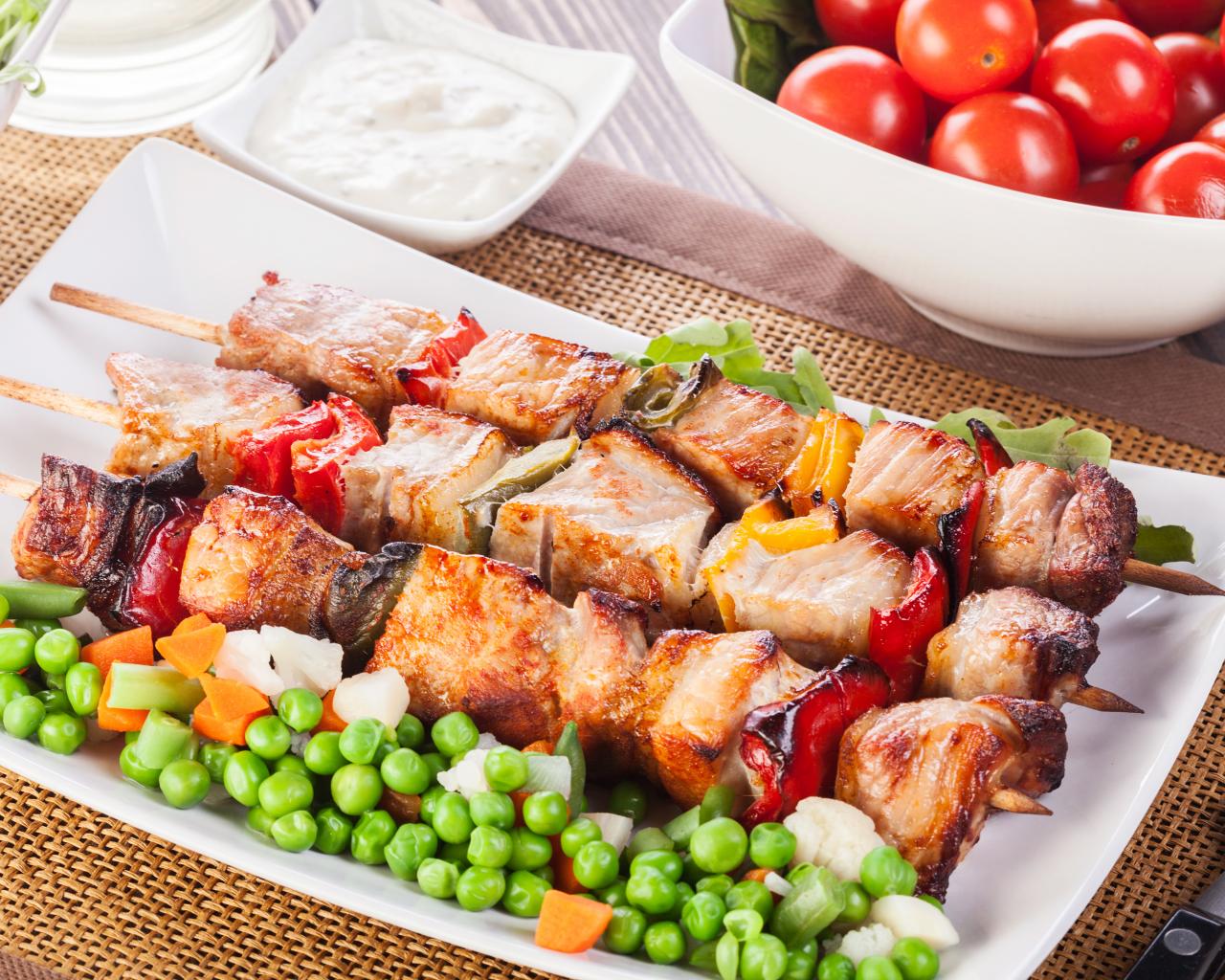 Wallpaper Appetizing ruddy skewers with green peas on a plate