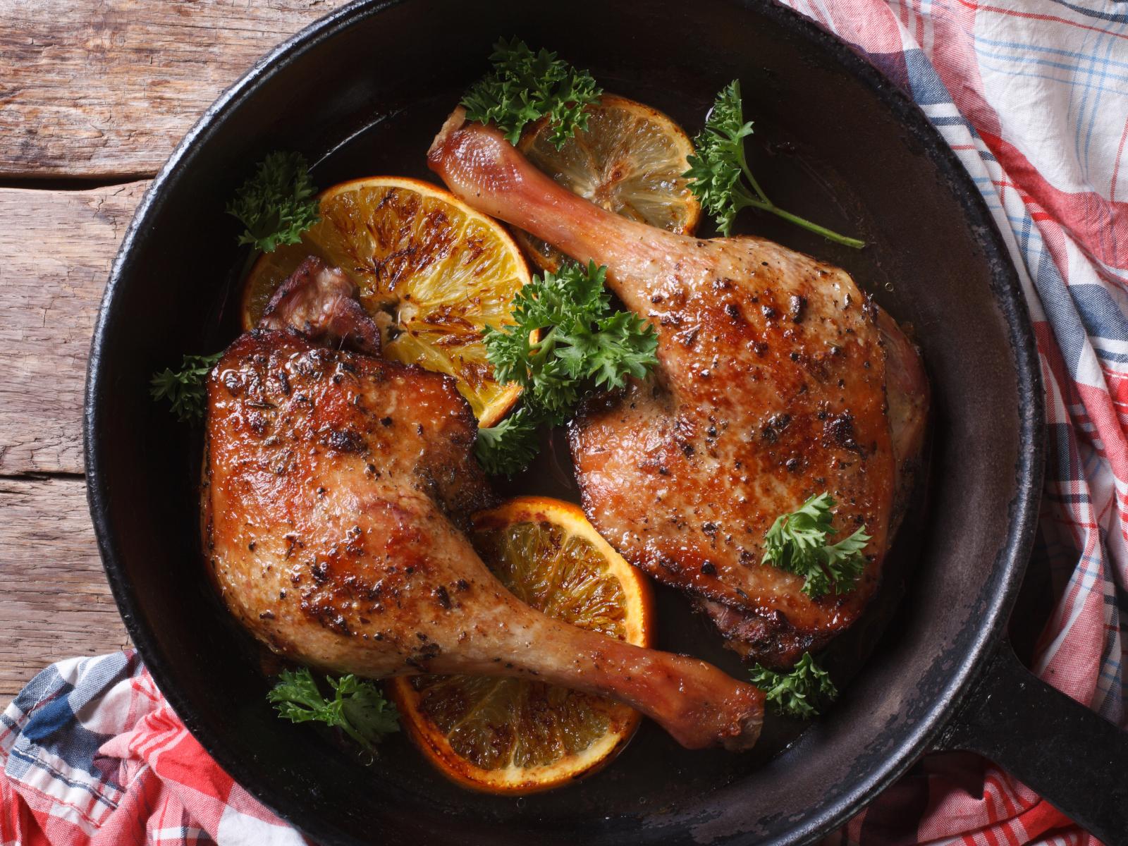 Wallpaper Chicken thighs in a pan with orange rings and parsley