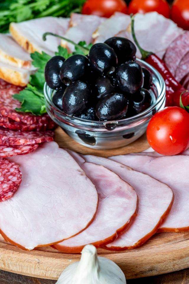 Wallpaper Sausage products on the board with olives